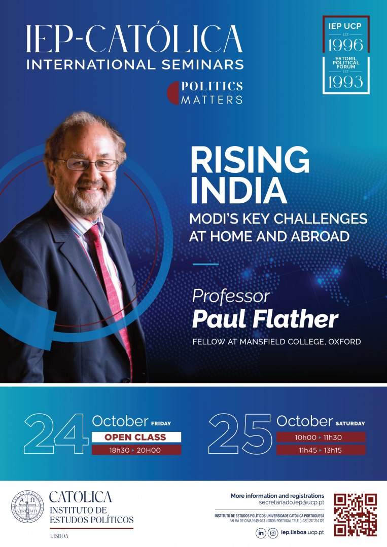 Recebemos o Professor Paul Flather, numa Open Class dedicada à Índia contemporânea e aos principais desafios enfrentados pelo Primeiro-Ministro Narendra Modi, tanto a nível interno como internacional. Seguem-se os Seminários privados com 2 sessões no dia 25.
